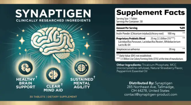 According to the creators of Synaptigen, it starts by supporting healthy blood flow and nutrient delivery to the brain, helping optimize neural activity. Second, it works to strengthen memory, focus, and concentration by supporting neurotransmitter balance. Finally, it promotes long-term brain health by protecting cells against oxidative stress and inflammation.